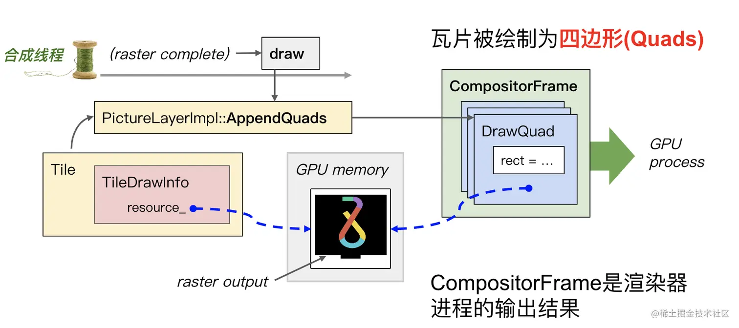 瓦片完成光栅化,合成线程将生成“绘制四边形”(Draw Quads)。