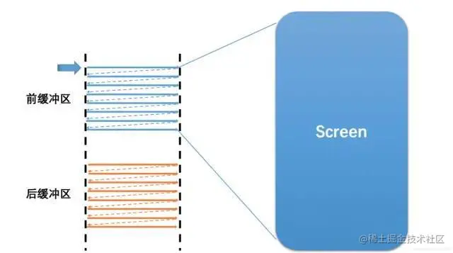 双缓存,让绘制和显示器拥有各自的buffer:GPU 始终将完成的一帧图像数据写入到 Back Buffer,而显示器使用 Frame/Front Buffer,当屏幕刷新时,Frame Buffer 并不会发生变化,当Back buffer准备就绪后,它们才进行交换。如下图:
