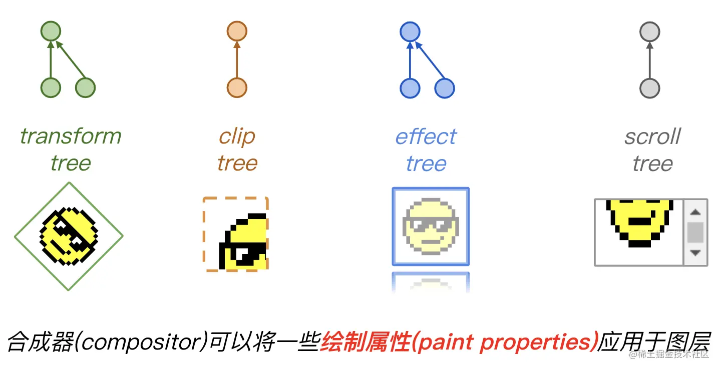 合成器可以对绘制图层的方式应用各种属性。这些属性存储在它们自己的树中。