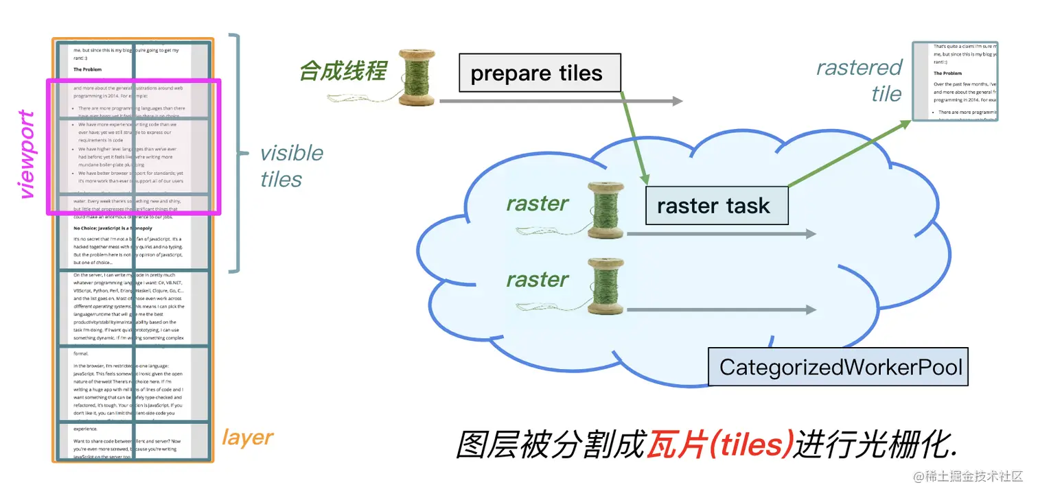 瓦片使用专用的光栅化线程池进行光栅化。瓦片的优先级基于它们与{视口|Viewport}的距离。