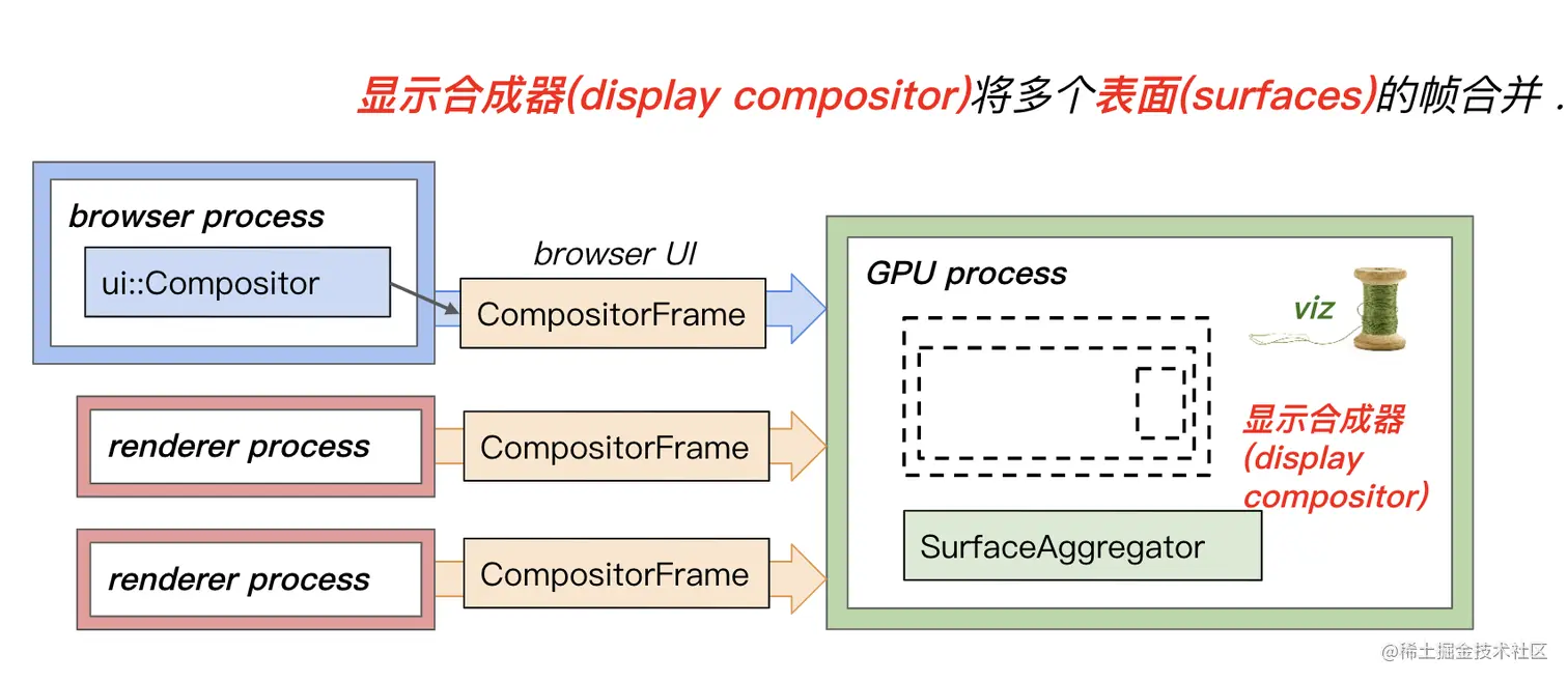 {合成帧|Compositor Frame}来自多个渲染器和浏览器(浏览器有自己的用于 UI 的合成器)。