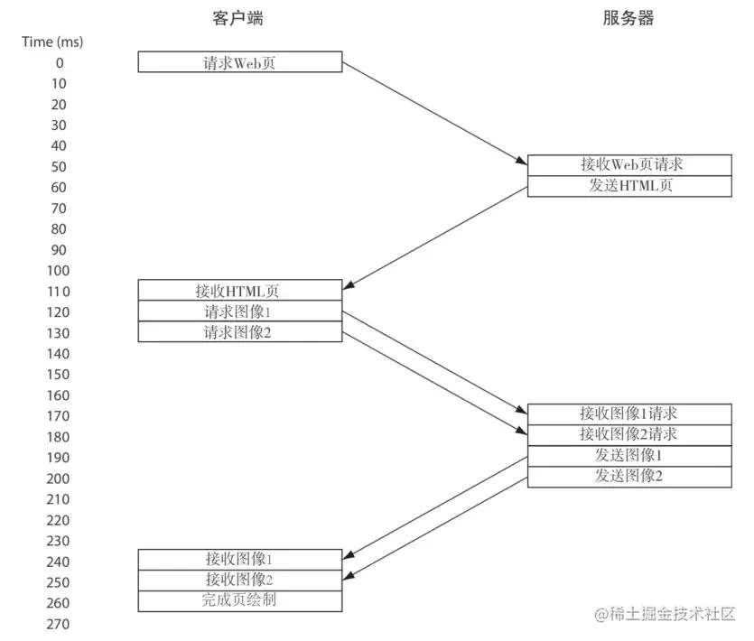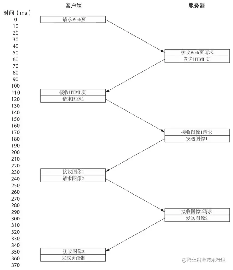 除了上面的变化之外,HTTP/1.1 还增加了更好的缓存方法,例如 Cache-Control 首部比之前的 Expires 首部功能更强大。这些能力的增强进一步加速了 Web 生态的蓬勃发展,然而随着网站需要加载的资源越来越多,如何进一步提升加载速度是亟需攻克的难题。HTTP/1.1 的版本中,为了解决这个问题,提出了管道化的概念,其思想非常简单:既然可以通过 Keep-Alive 保持连接,就能复用一个传输通道,此时把串行的 HTTP 请求变成并行的岂不是可以提升加载速度了?例如在 HTTP/1.0 中一个带两张图片的网页,总共需要发送三个请求: