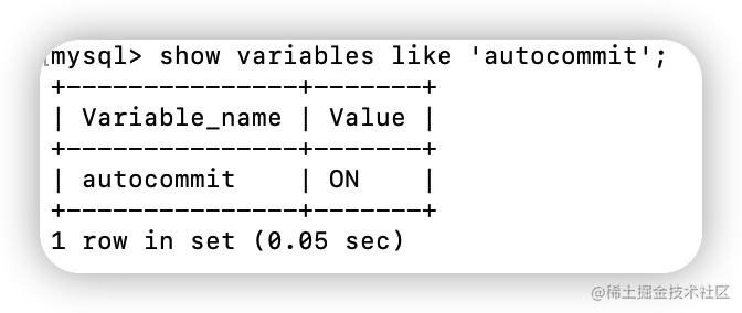 mysql> show variables like 'autocommit';+---------------+-------+| Variable_name | Value |+---------------+-------+| autocommit | OFF |+---------------+-------+1 row in set (0.01 sec)