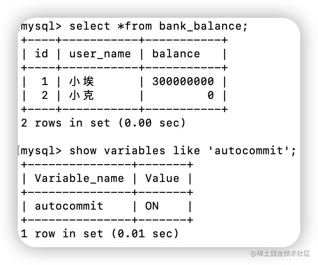 update bank_balance set balance = balance - 300000000 where user_name = '小埃';Query OK, 1 row affected (0.01 sec)Rows matched: 1 Changed: 1 Warnings: 0