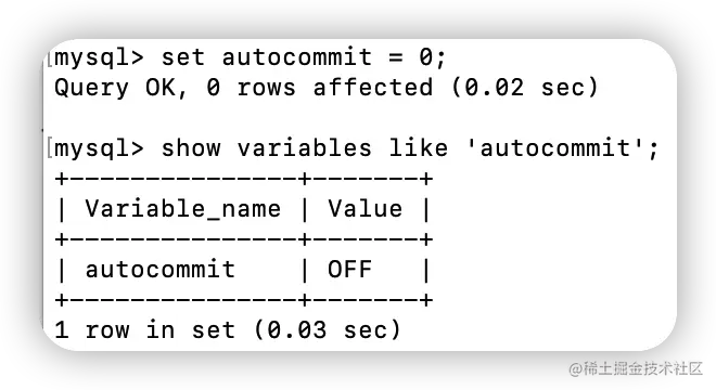 mysql> set autocommit = 0;Query OK, 0 rows affected (0.00 sec)
