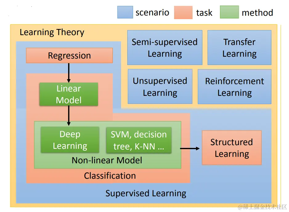 主要包括监督学习、半监督学习、迁移学习、无监督学习、监督学习中单结构化学习、强化学习