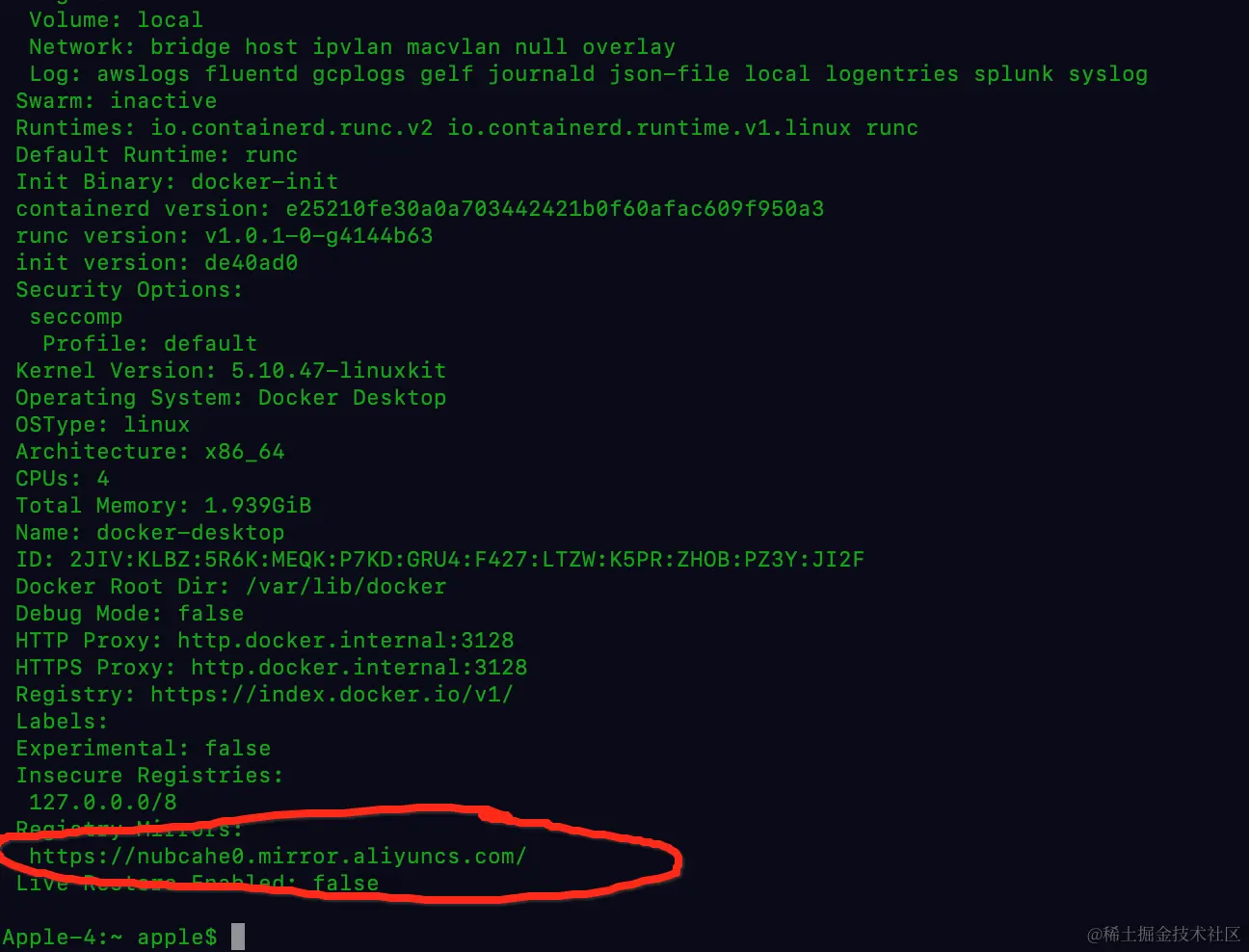 执行 docker info 命令查看是否配置成功,如下图所示我配置成功