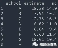 此外,用户可以通过输入plot(schools.sim)生成结果图。结果图如图所示。在该图中,左列显示了以下内容的快速摘要:
