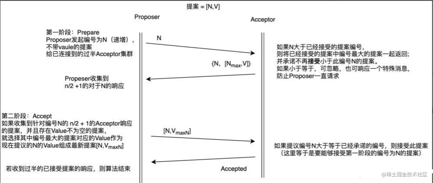 Proposer需要发出两次请求,Prepare请求和Accept请求。Acceptor根据其收集的信息,接受或者拒绝提案。
