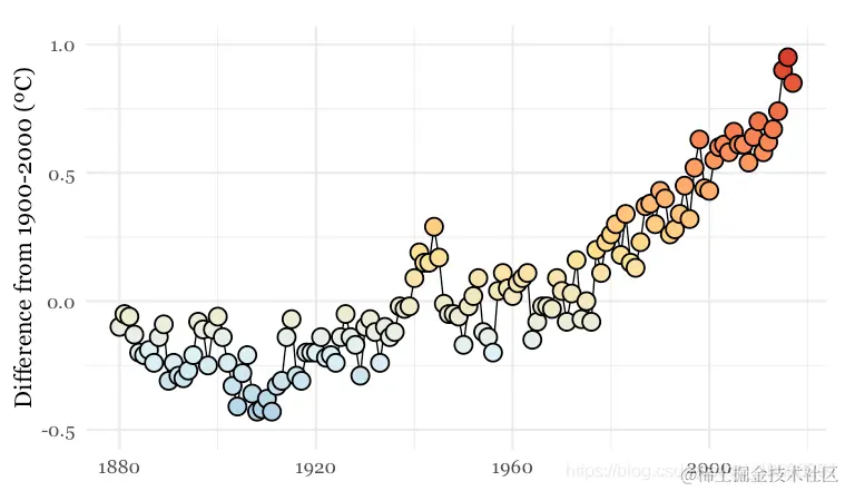 因为这是一个点-线图,它包括geom_line与geom_point层。我们可以将轮廓设置color为黑色,然后aes根据温度使用映射将其填充为颜色value。
