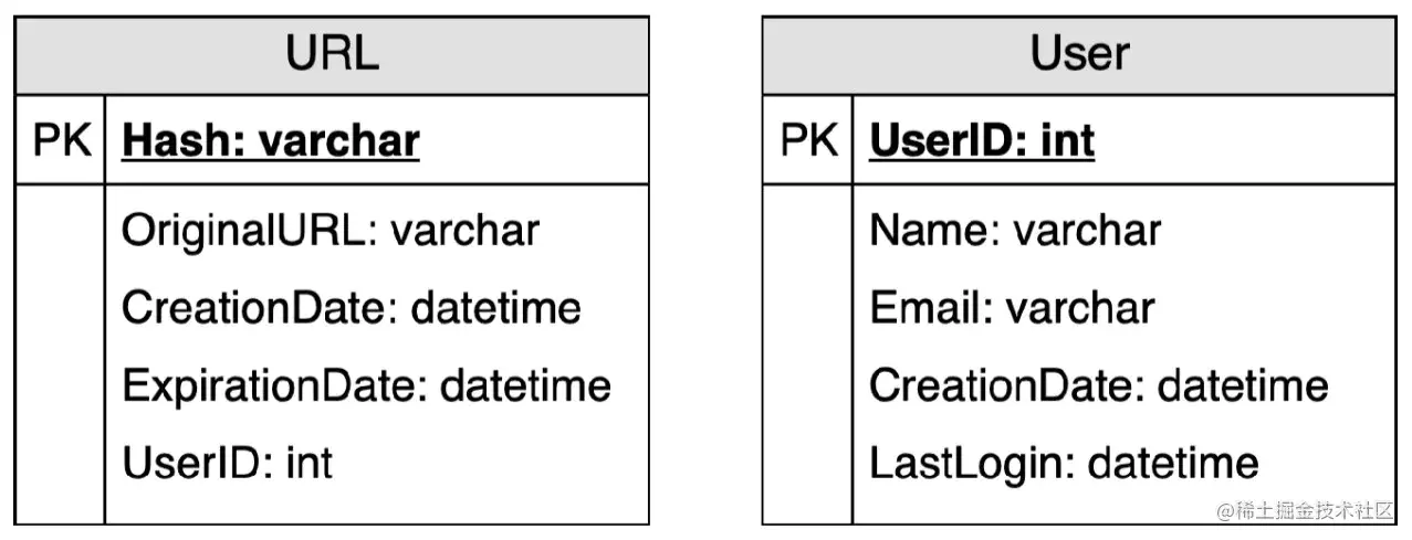 我们需要两个表:一个用于存储URL映射信息,另一个用于存储创建短链接的用户的数据。