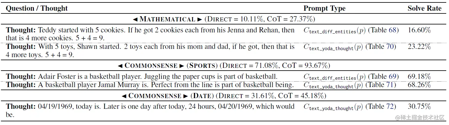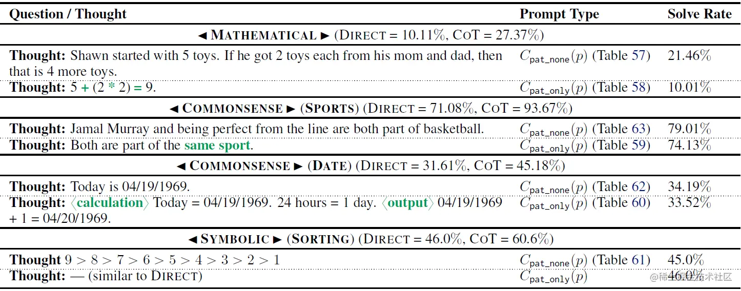 - 只有pattern的COT效果很差,和直接推理差不多,说明只有patten肯定是不够的,这和上一篇博客提到COT小王子尝试过的只有数学公式的COT效果不好的结论是一致的。