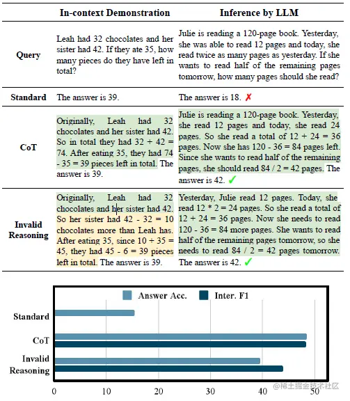 如下图所示,作者手工把正确的In-Context COT样本改写成错误的,改写方式是在保留部分推理顺序,和部分bridge object的前提下,随机的把推理改成错误的推理逻辑。作者发现魔改后错误的few-shot的样本,对比正确的few-shot-cot保留了80%+的水平,只有小幅的下降。