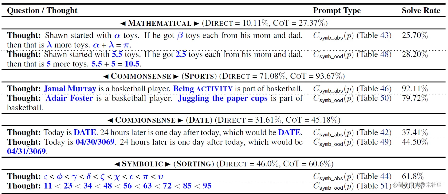 OOD类似随机替换,不过论文的替换方式有些迷幻。对于GSM8k数学问题,作者用一一对应的数学数字替换了文字数字;对于体育常识问题的替换比较常规作者用随机的人名和赛事进行替换;对于时间常识问题作者用未来时间替换了当前时间?? 注意这里的替换作者保证了推理逻辑的一致性,包括同一数字用同一symbol替换,替换实体也符合推理逻辑,以及对问题中的答案也进行了替换。所以这里纯纯只能论证symbol本身的取值和类型(例如数字1和一)是否对COT有影响