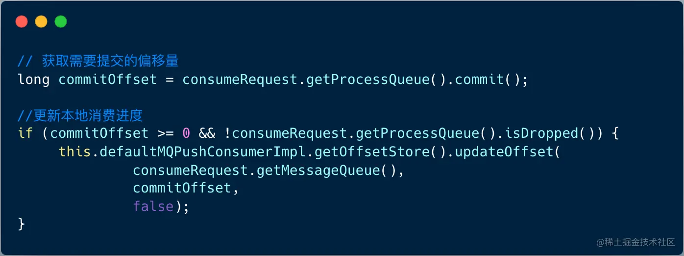 消费成功时,首先计算需要提交的偏移量,然后更新本地消费进度。