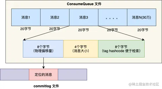 每个 consumequeue 文件包含 30 万个条目,每个条目大小是 20 个字节,每个文件的大小是 30 万 * 20 = 60万字节,每个文件大小约 5.72M 。