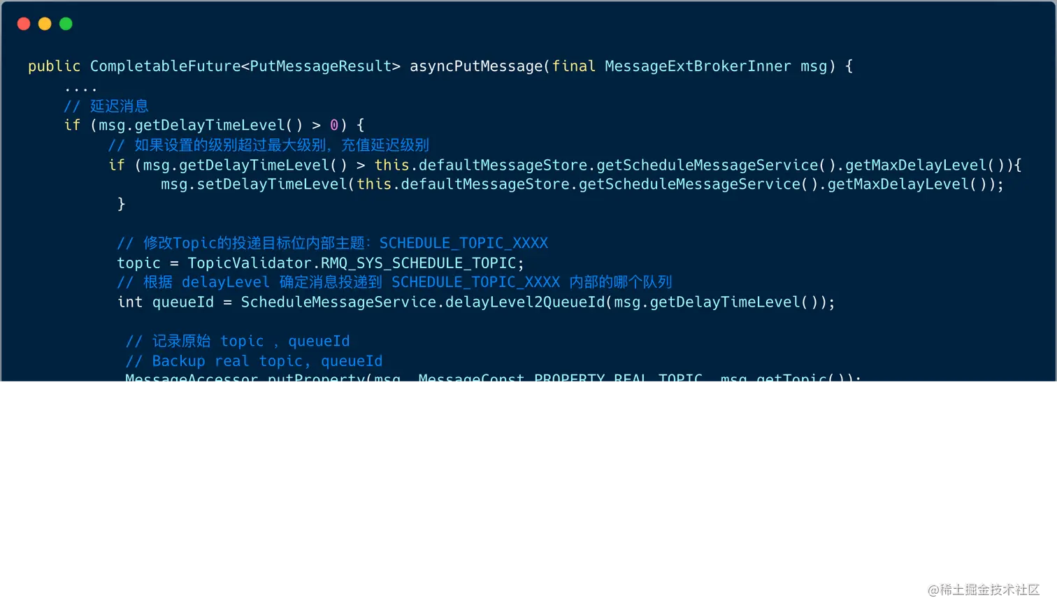 但由于消息一旦存储到 consumequeue 中,消费者就能消费到,而延迟消息不能被立即消费,所以 RocketMQ 将 Topic 的名称修改为SCHEDULE_TOPIC_XXXX,并根据延迟级别确定要投递到哪个队列下。