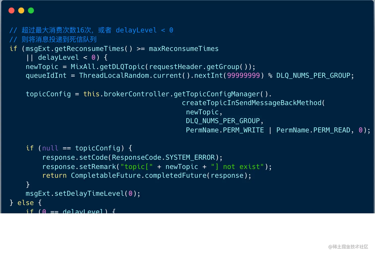 首先判断消息的当前重试次数是否大于等于最大重试次数,如果达到最大重试次数,或者配置的重试级别小于0,则重新创建 Topic ,规则是 %DLQ% + consumerGroup,后续处理消息发送到死信队列。