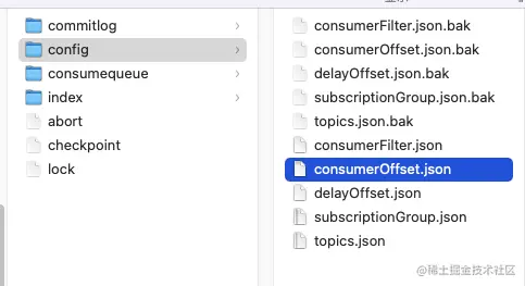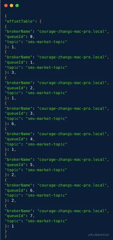 我们浏览下集群消费场景下的 Broker 端的消费进度文件 consumerOffset.json 。