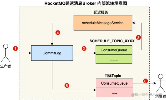 延迟消息在 RocketMQ Broker 端的流转如下图所示:
