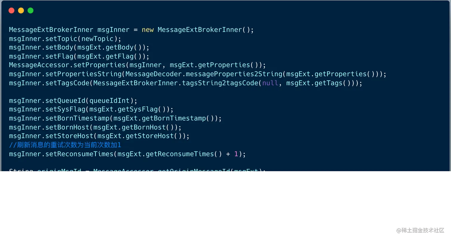 同时,还会将消息原来要发送到的目标 Topic 和队列信息存储到消息的属性中。
