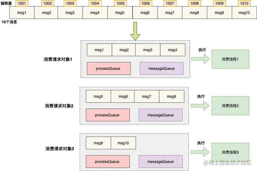 消费者实例内 ,processQueueTable 对象存储着当前负载均衡的队列 ,以及该队列的处理队列 processQueue (消费快照)。