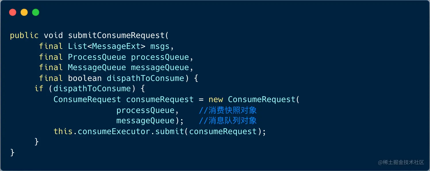 consumeMessageService的submitConsumeRequest方法 ,消费消息服务内部有一个消费线程池; - 消费线程池的消费线程从消费任务队列中获取消费请求,执行消费监听器
