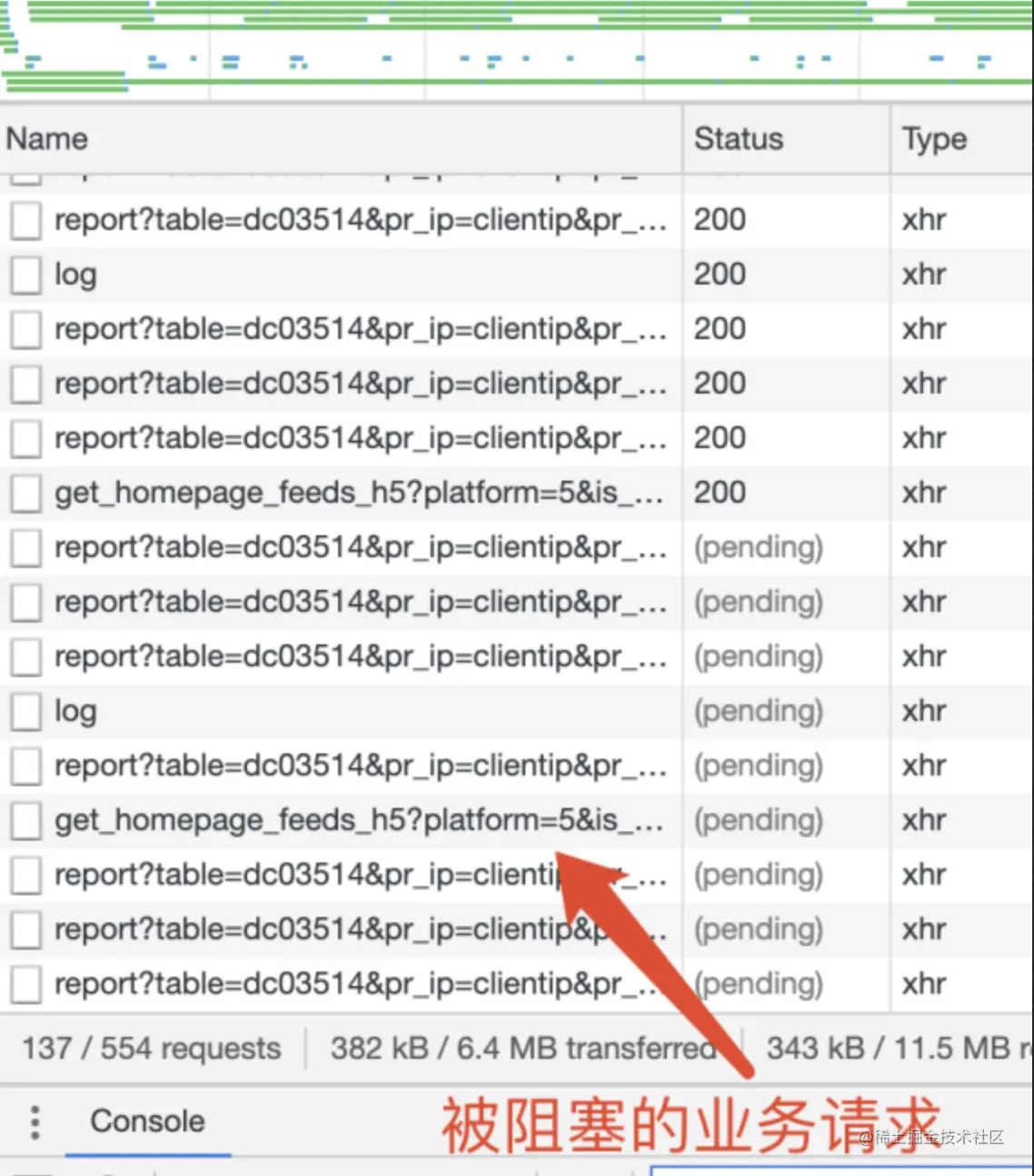 如下图,以微信小程序为例,在请求过多时,业务与埋点类的请求争抢请求资源,造成业务请求排队,导致页面展示滞后,弱网情况甚至造成卡顿。