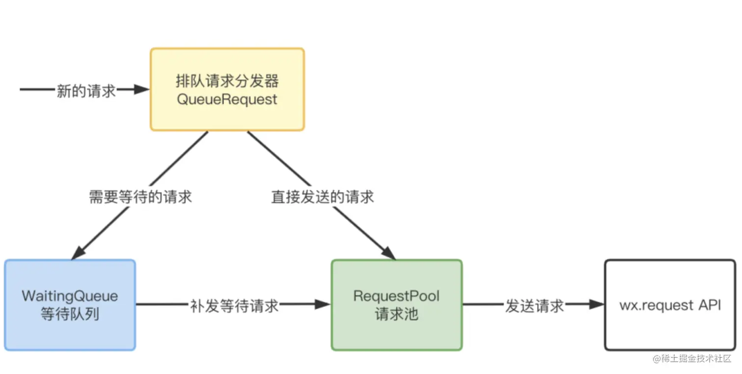 等待队列 WaitingQueue:维护需要延时发送的请求等待队列。在请求池空闲或请求超过最长等待时间时,补发等待请求。