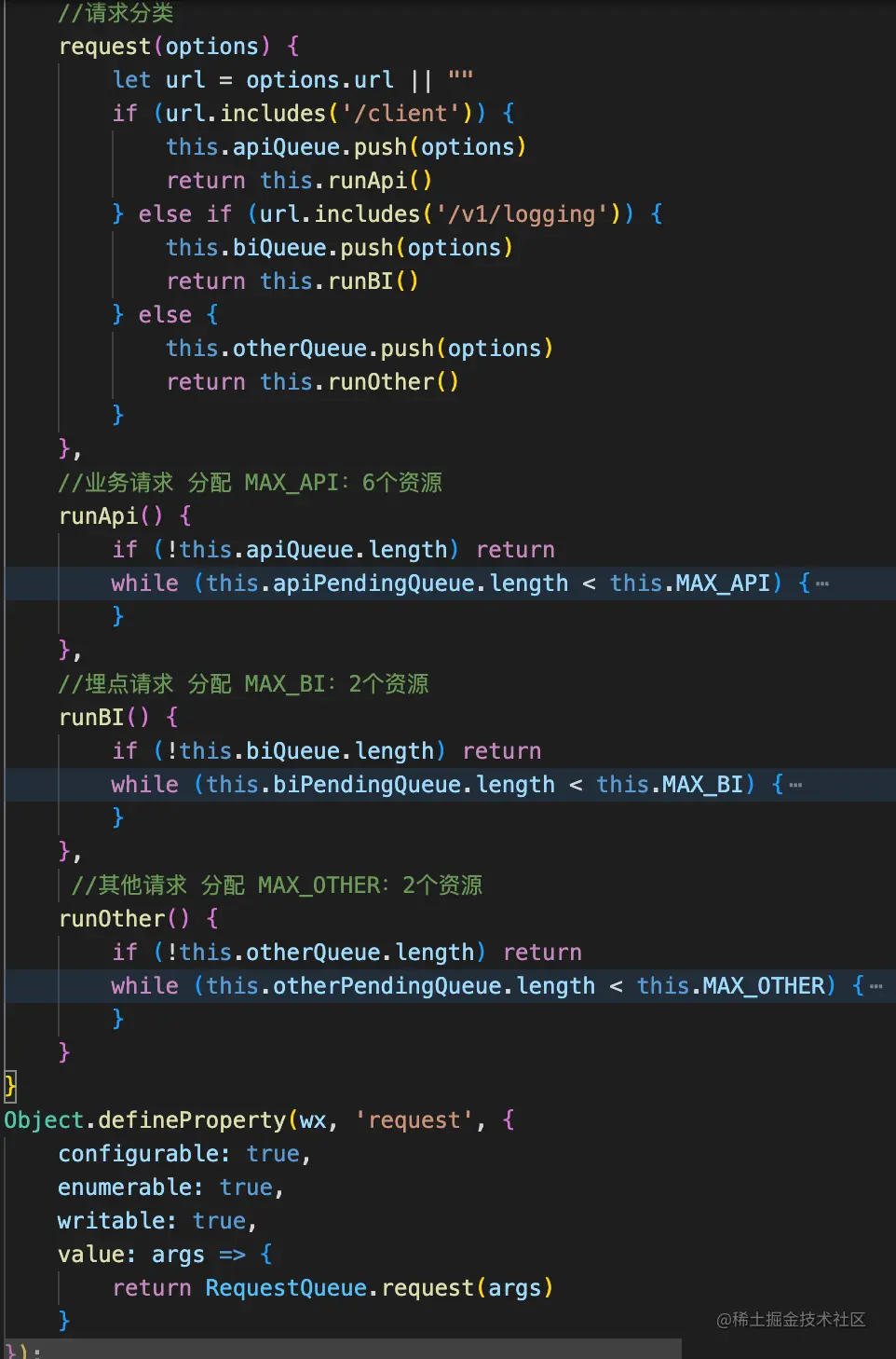 该思路是将微信的10个请求资源,分成3个请求池,业务请求:埋点类:其他请求的比例为6:2:2。比例可以自行调整。