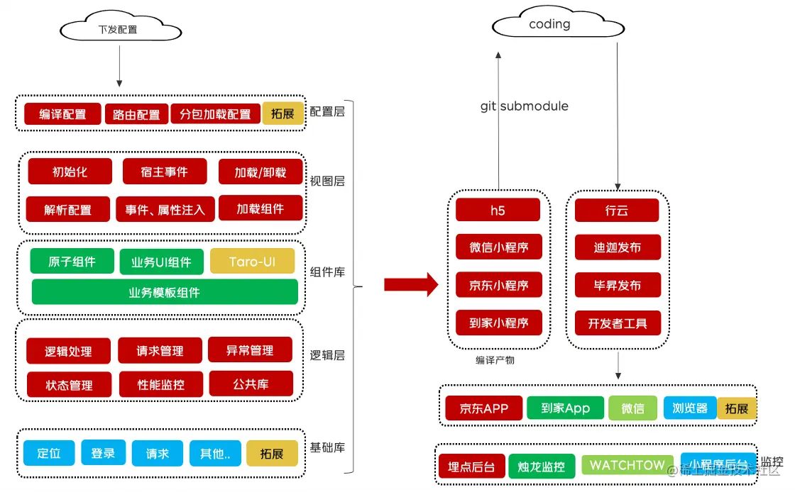 1.配置层:主要包含编译配置、路由配置、分包加载、拓展口子。
