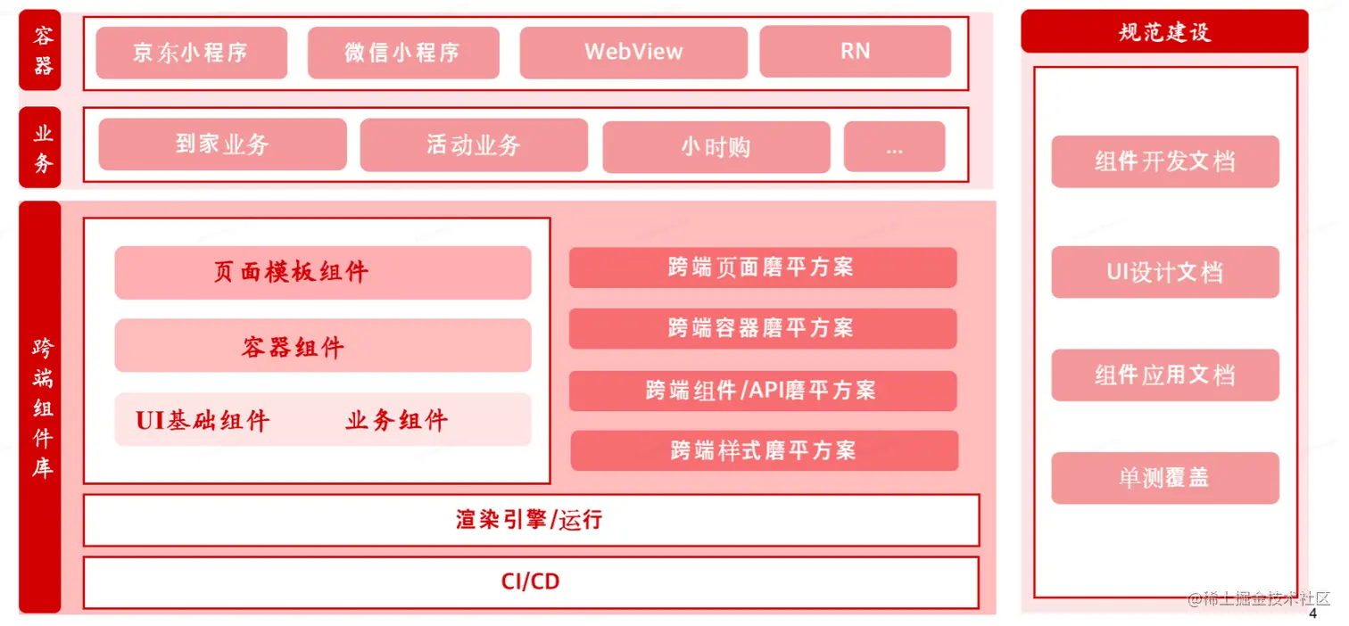 3.组件库:是一个单独维护的项目,多端组件库包括业务组件和原子组件,可由视图层根据配置动态加载组件。