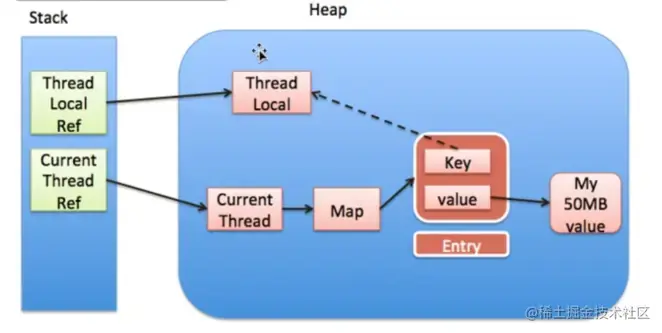 3、都没有人会再用key了,但是我的Entry还是没被回收,虽然我调用set()或者get()时会可能出发expungStaleEntry() 这个玩意就是把key应用为空的entry回收,但是偶发呀,你看下边都是强引用狗链条,所以只要我thread一天不死,这玩意就活着。那么一个50MB(我随便写的)永远无法释放,如果10个就是500M,那么内存泄漏就有可能。