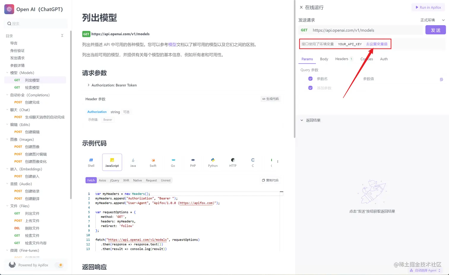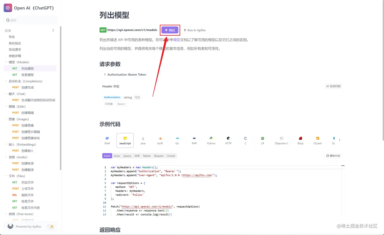 OpenAI API 的在线调试地址为:openai.apifox.cn/ , 点击即可访问。