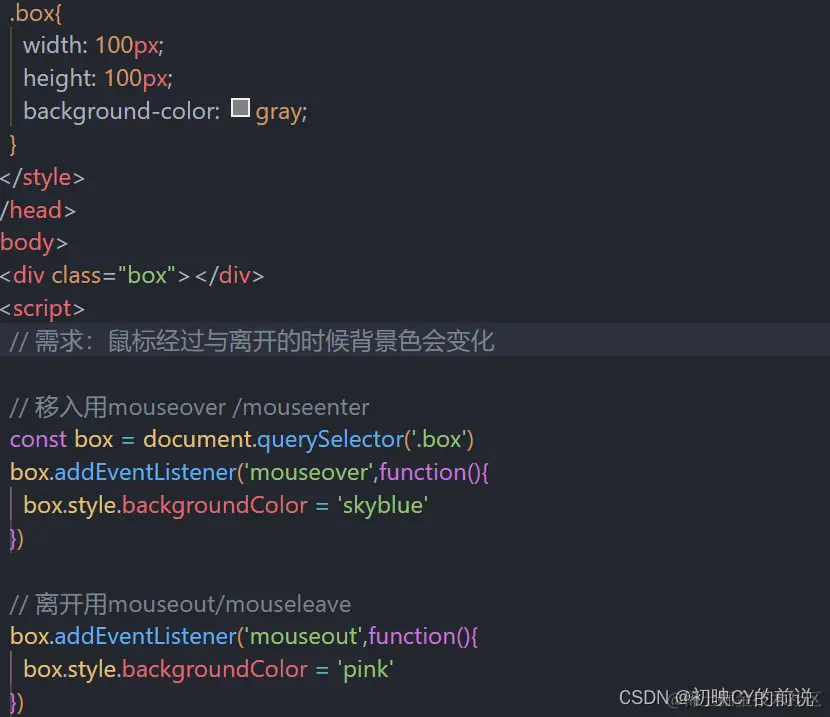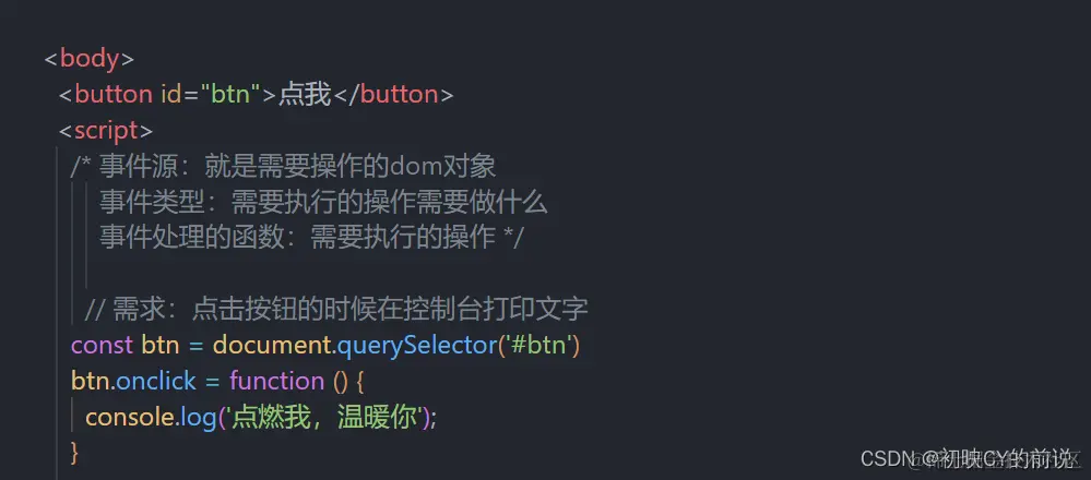 - 事件类型:用什么方式触发,比如鼠标单击 click、鼠标经过 mouseover 等