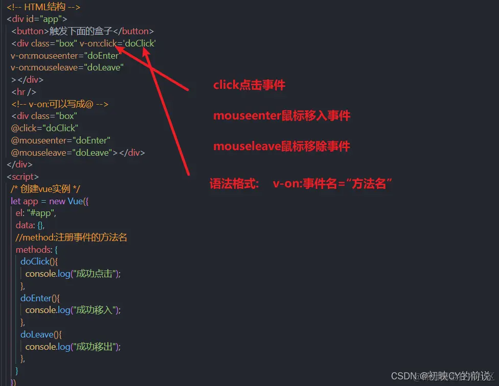 v-on是搭配事件来使用的。常见的事件(click,keyup,mouseenter,mouseleave等)。
