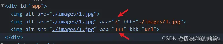 可以绑定元素标签与属性,同时标签也具有解析作用,如下图中的aaa加上了:就具有了解析的作用,同时的话也是自定义了一个属性取名为aaa