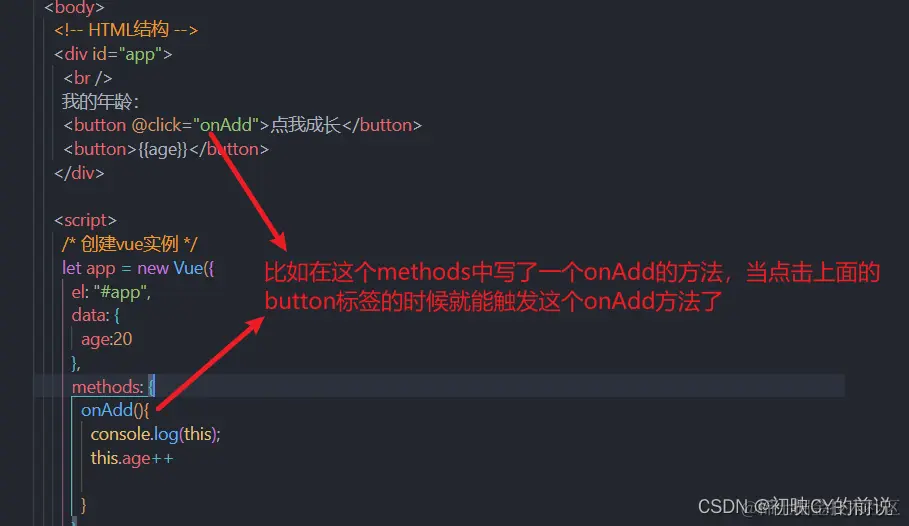 语法格式:v-on:click="方法名" 简写格式为:@click="方法名"
