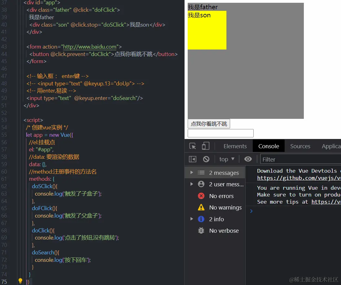 通过下面这个可以看到,我们在v-on这个的事件基础上加了一些限制功能,我们可明显的看到我们阻止了子盒子向外的冒泡与我们阻止了跳转等等。
