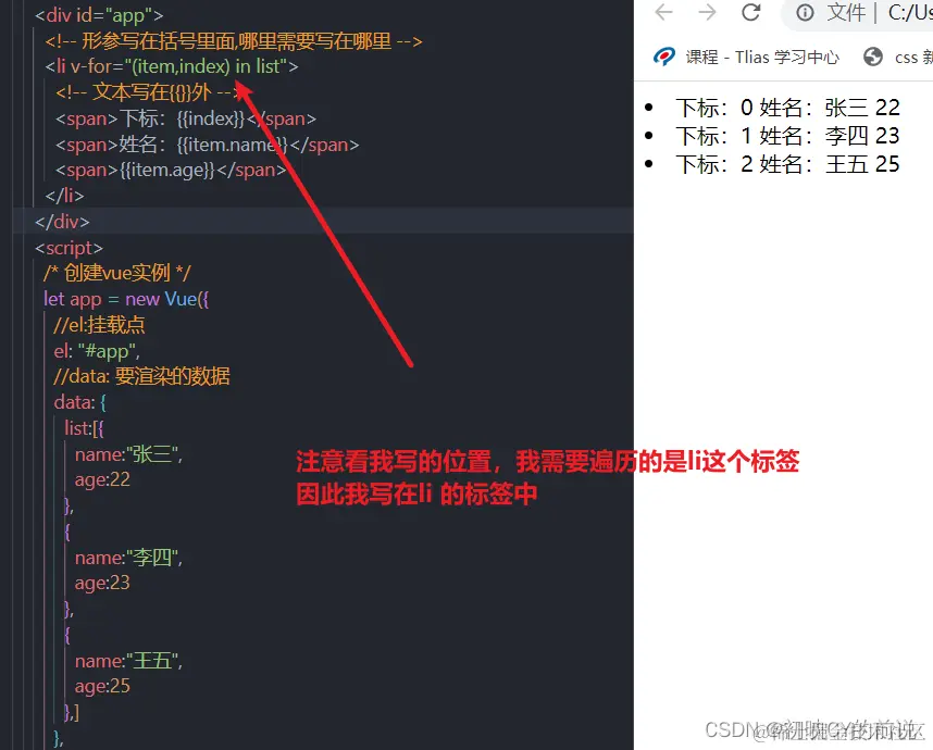 语法格式:v-for="(item, index) in 数组" (括号内为形参不需要index可以不写)
