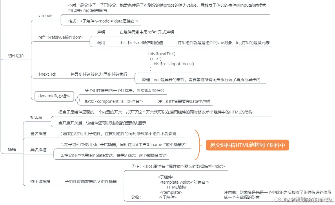 🤘本文核心 :v-modedl表单双向绑定、ref|$ref操作dom、dynamic动态组件、$nextTick同步、匿名插槽、具名插槽、作用域插槽