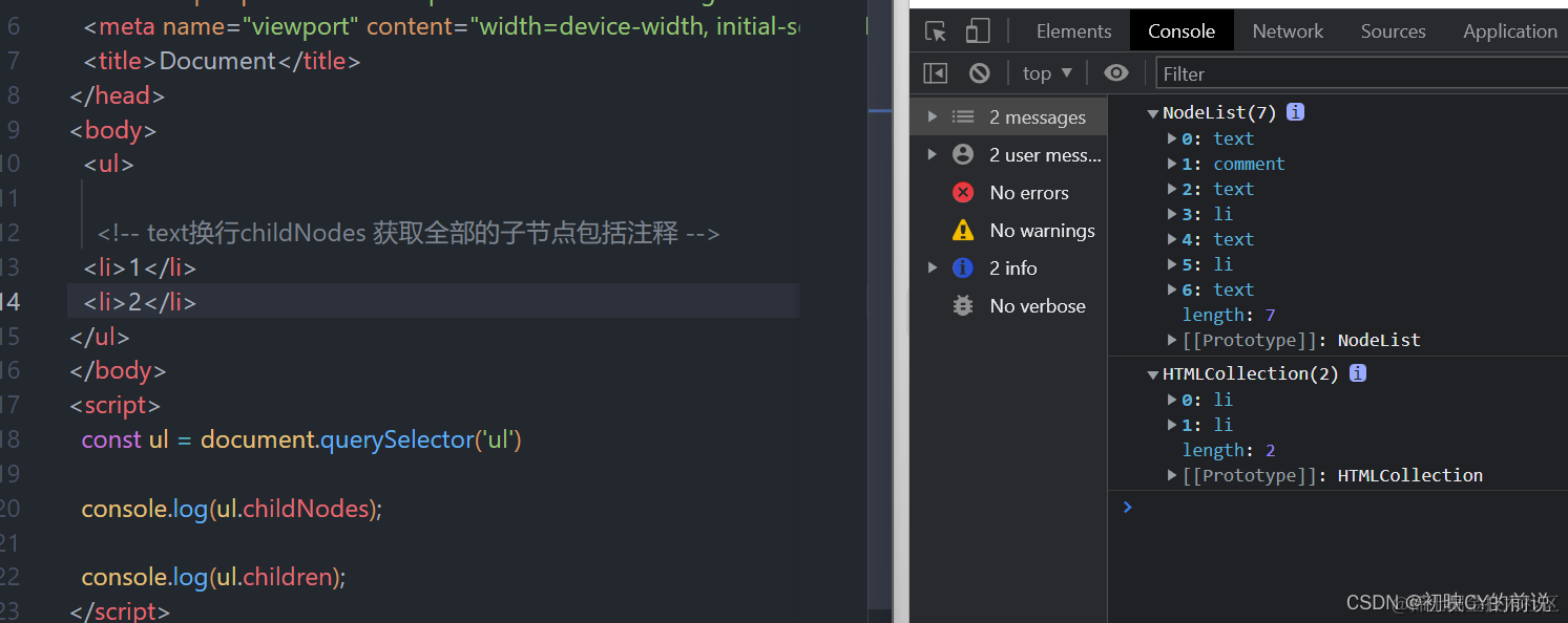 - childNodes 获得所有子节点、包括文本节点(空格、换行)、注释节点等