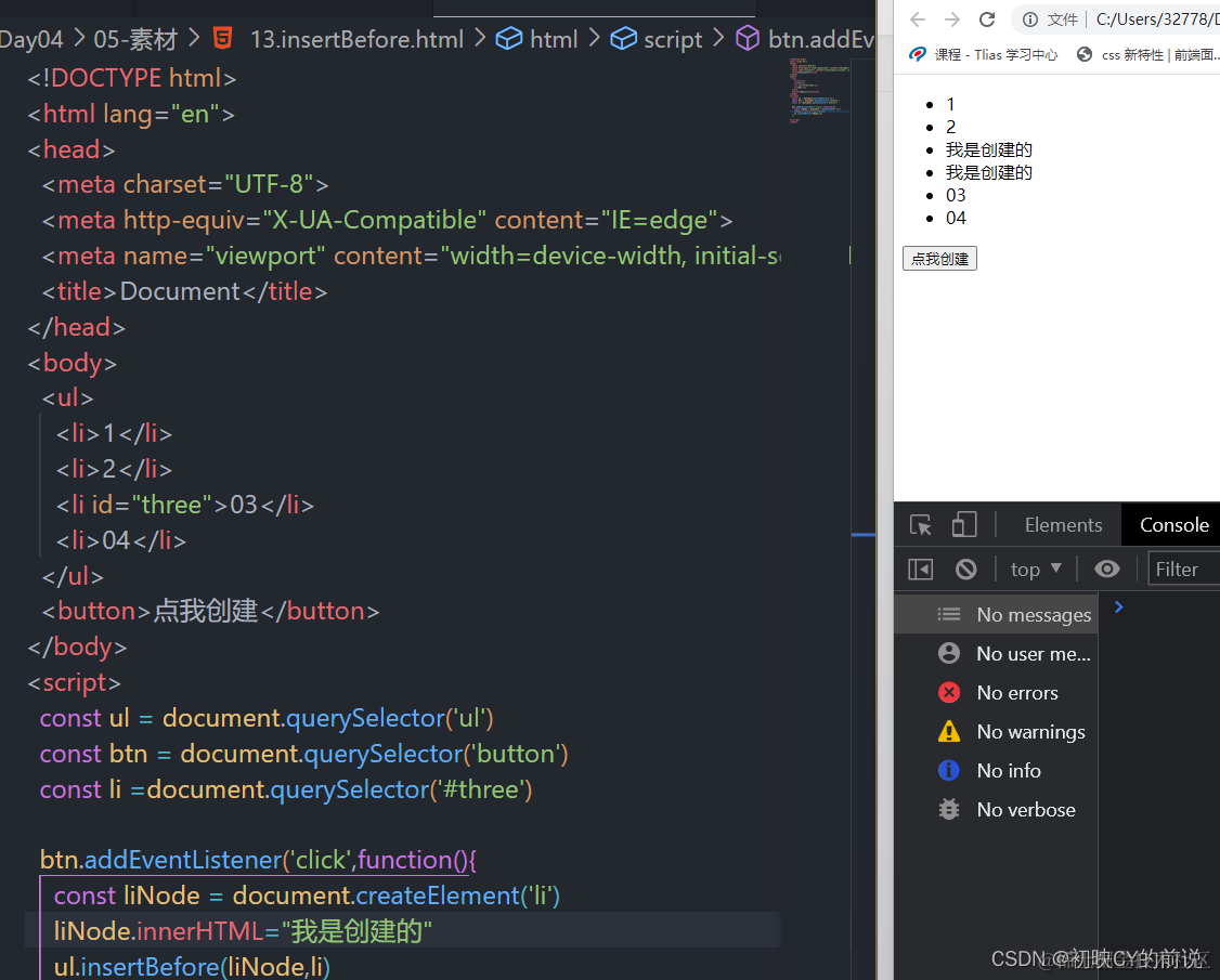 父元素.insertBefore(要追加的子元素,在那个元素的前面追加)