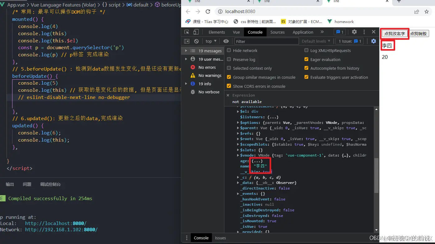 经历了上述的四个阶段的操作现在我们完成了组件data中的被数据获取到页面渲染的整个流程,接下来的钩子是用于修改data数据与销毁我们的vue实例