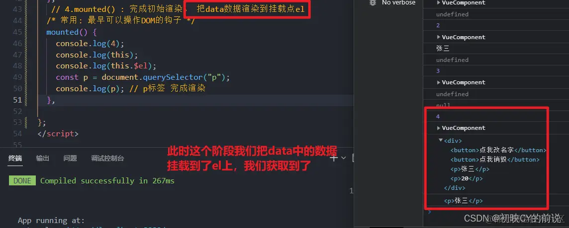 // 4.mounted() : 完成初始渲染。 把data数据渲染到挂载点el