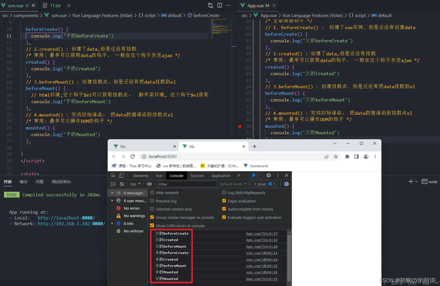 发现是我们父元素先执行到beforeMont,随后等子渲染完成(执行子的mounted)最后将父的mounted执行完成,完成我们最终的渲染。虽然是有包含关系,但是执行流程是不变的。