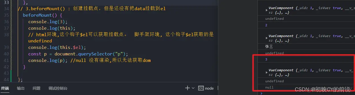 // html环境,这个钩子$el可以获取挂载点。 脚手架环境, 这个钩子$el获取的是undefined