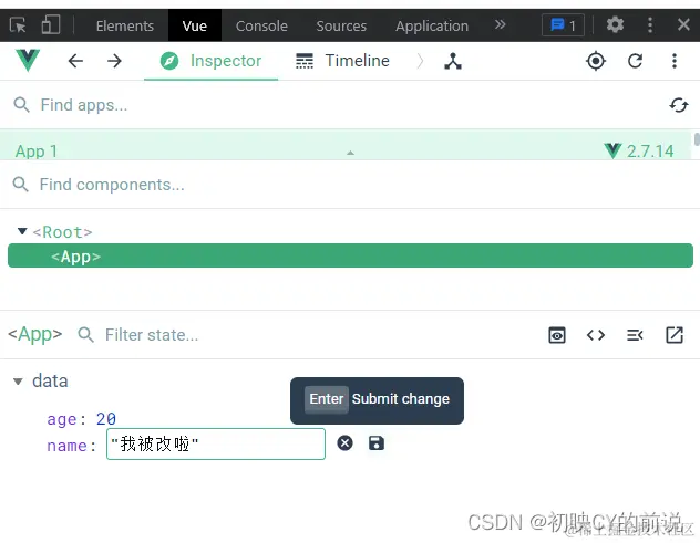 第二步:我们现在在vuetools中修改data中的数据,当修改数据后面不变化!当我确定的时候会依旧变成张三。但是我们的内存中会显示出我们修改过的内容