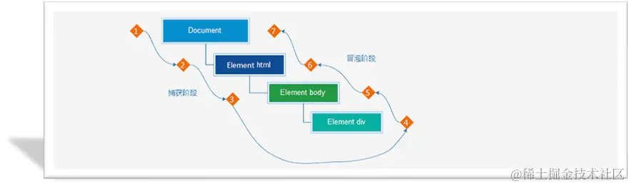 - 说明:假设页面里有个div,当触发事件时,会经历两个阶段,分别是捕获阶段、冒泡阶段