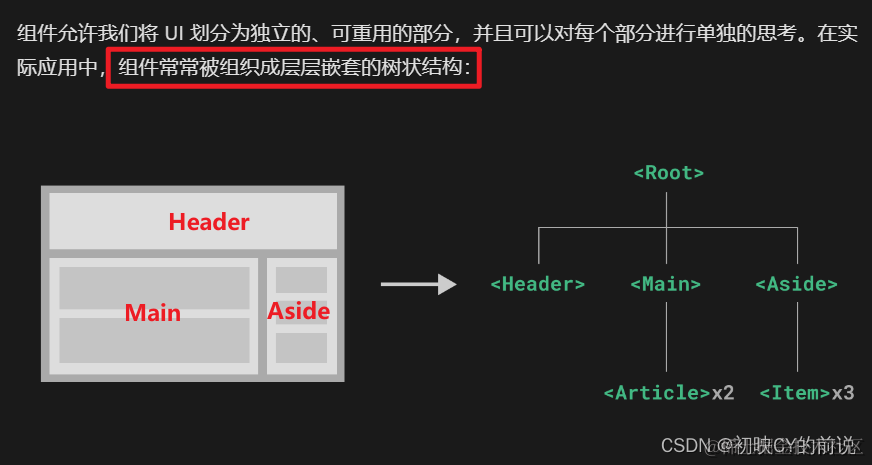上述我们之前一般是用三个大的div(Header、Main、Aside)来封装我们的页面的再细分下去其他模块结构,现在我们用vue组件表示来就是再Root这个根组件中用引入对应的组件标签就可以了